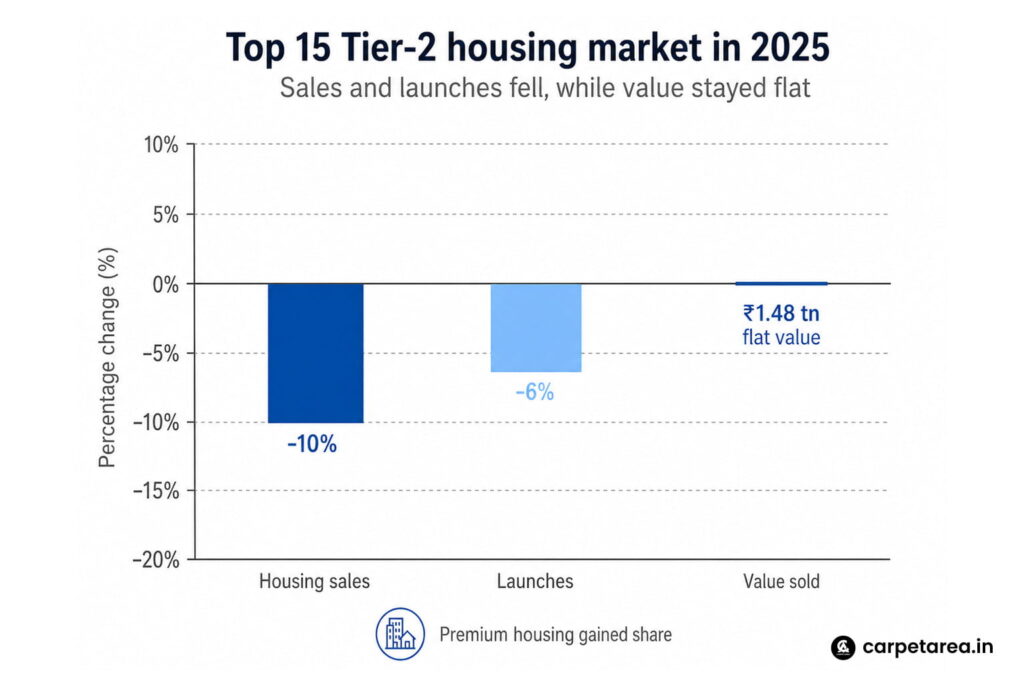 At the same time, this is not a simple one-way success story. There are important cautions here too. Business Standard reported in February that housing sales in the top 15 Tier-2 cities fell 10 percent in 2025, while launches fell 6 percent. That sounds like a contradiction to the broader growth narrative, but it actually tells a more useful story. It suggests that Tier-2 growth is real, but not effortless. Some markets are improving in value and quality even when sales volumes soften. The same report said the value of housing sold stayed flat at ₹1.48 trillion, while premium housing gained share. So the next cycle in smaller cities may not be only about more units. It may be about better projects, evolving buyer preferences, and stronger value concentration.