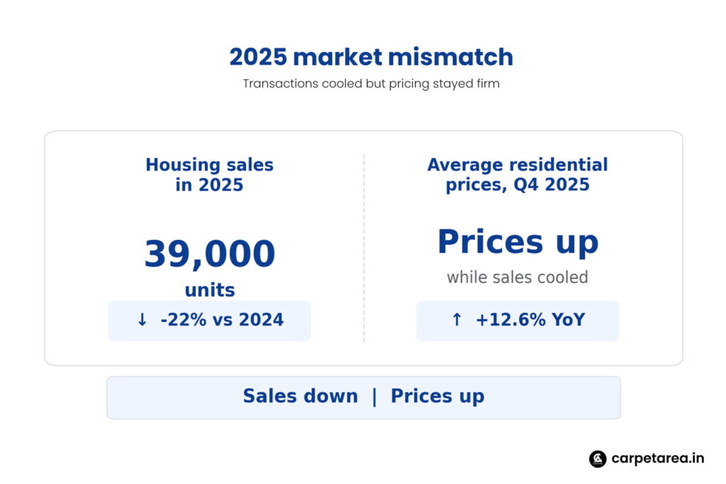 Recent reporting shows that Delhi-NCR has started showing signs of moderation even though pricing remains firm. JLL data cited by Realty+ said NCR’s housing sales in 2025 were around 39,000 units, down almost 22 percent from 2024, while average residential prices in the fourth quarter were still up 12.6 percent year on year. In simple terms, transactions cooled, but values did not fall with them. That is the kind of mismatch that usually grabs attention because it suggests demand is becoming more selective rather than disappearing altogether.