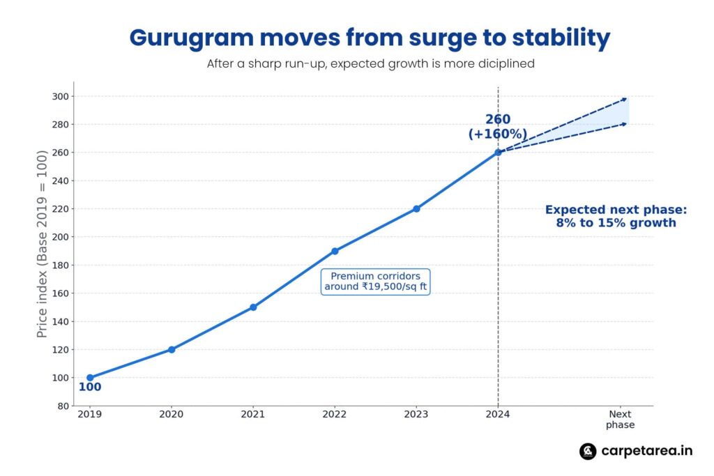 Gurugram is a good example of this shift. The Tribune, citing CBRE’s India Residential Market Outlook, reported that key Gurugram micro-markets saw property prices rise nearly 160 percent between 2019 and 2024, reaching around ₹19,500 per sq ft in premium corridors. At the same time, the report suggested that the market is now moving into a more stable phase, where income growth is starting to catch up and affordability pressures may ease slightly. Prices are still expected to rise in high-demand zones, but more in the range of 8 to 15 percent, not in the kind of speculative spikes seen earlier. That suggests the era of sharp runaway appreciation may be giving way to a more disciplined market.