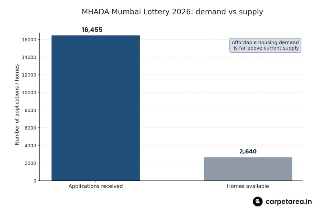 Mumbai’s property market has delivered a very clear message this season, and it did not come from a luxury launch, a record transaction, or a premium tower on a new corridor. It came from the response to affordable housing. The latest MHADA Mumbai lottery attracted more than 16,400 applications for 2,640 homes, turning what could have been seen as a routine housing scheme into one of the sharpest signals yet about the city’s deep affordability pressure. The homes were opened for applications from the end of March, and the draw has been scheduled for 15 May 2026.